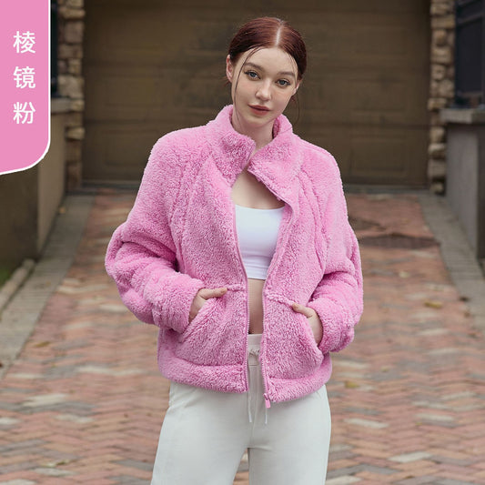 09/2024 Autumn and winter plush warm outdoor sports women's short stand-up collar constant temperature fitness tops thickened loose versatile coat