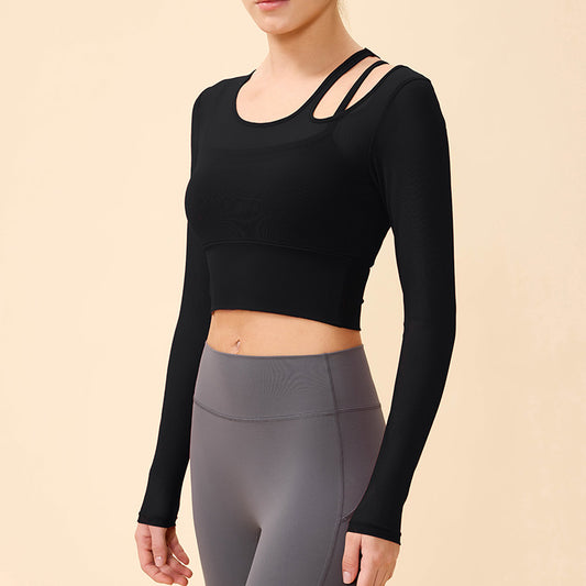 09/2024 Autumn and winter new net yarn fake two yoga long-sleeved top women's single shoulder hollow free two wear running fitness clothes