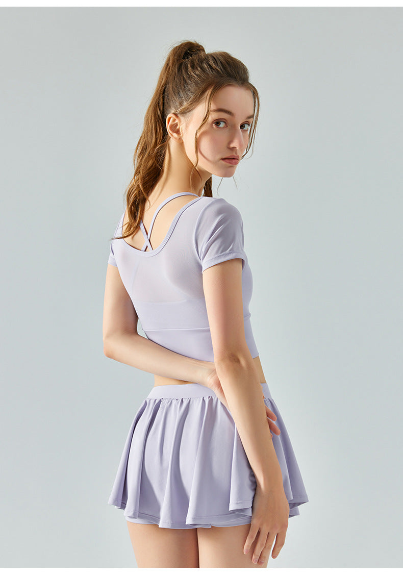 Mesh fake two-piece yoga short-sleeved women's one-piece chest pad sports T-shirt fitness clothes