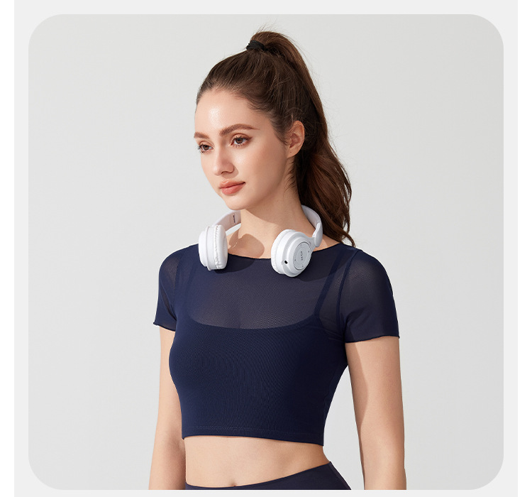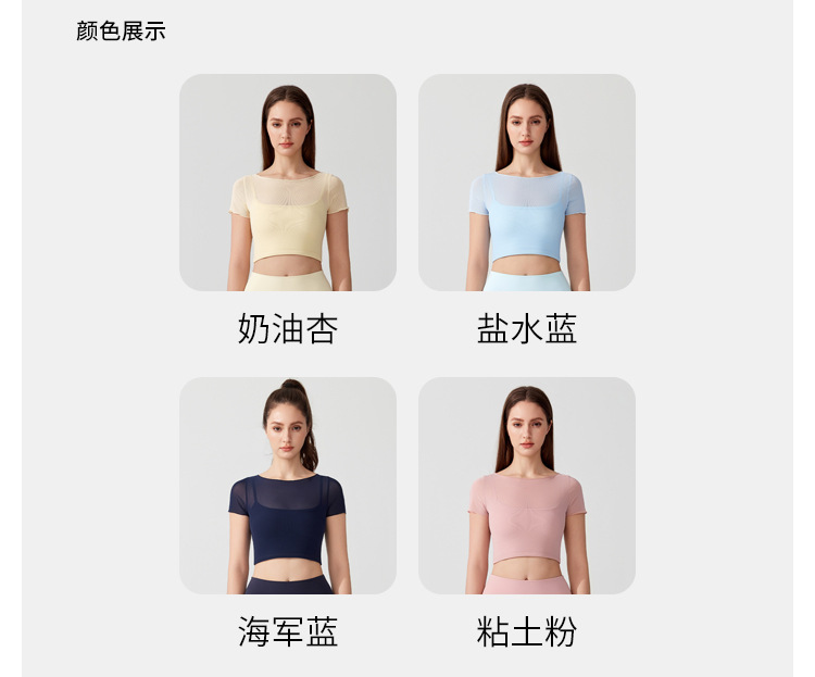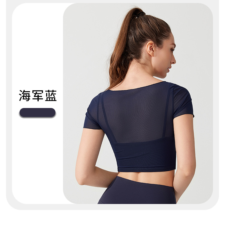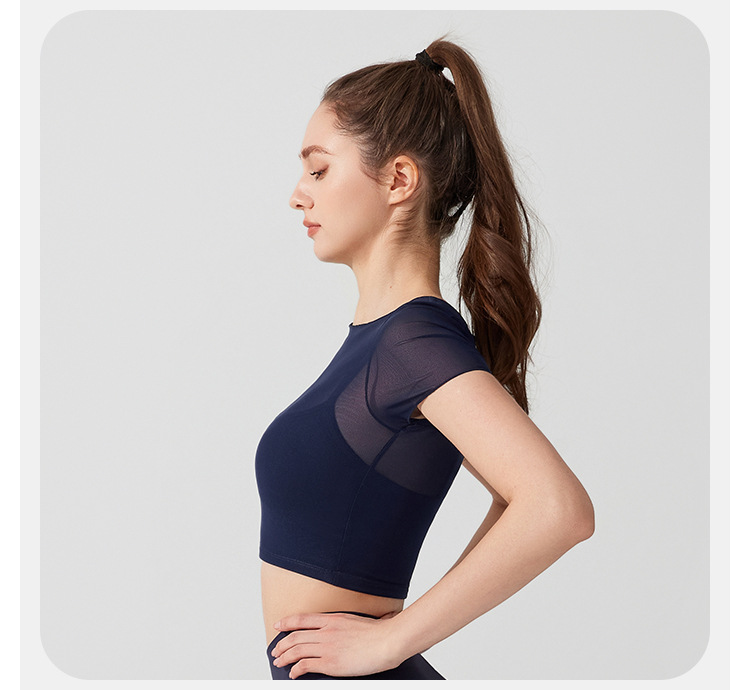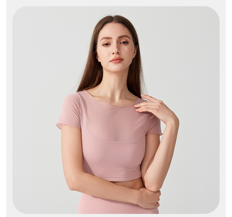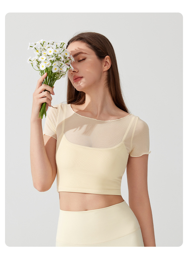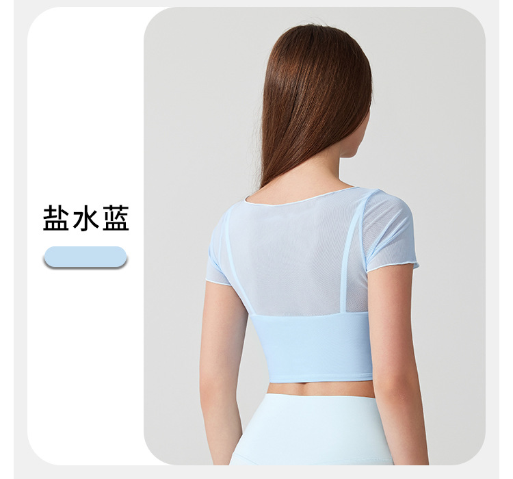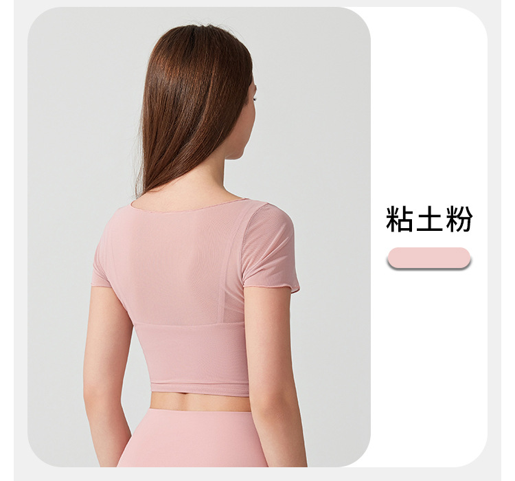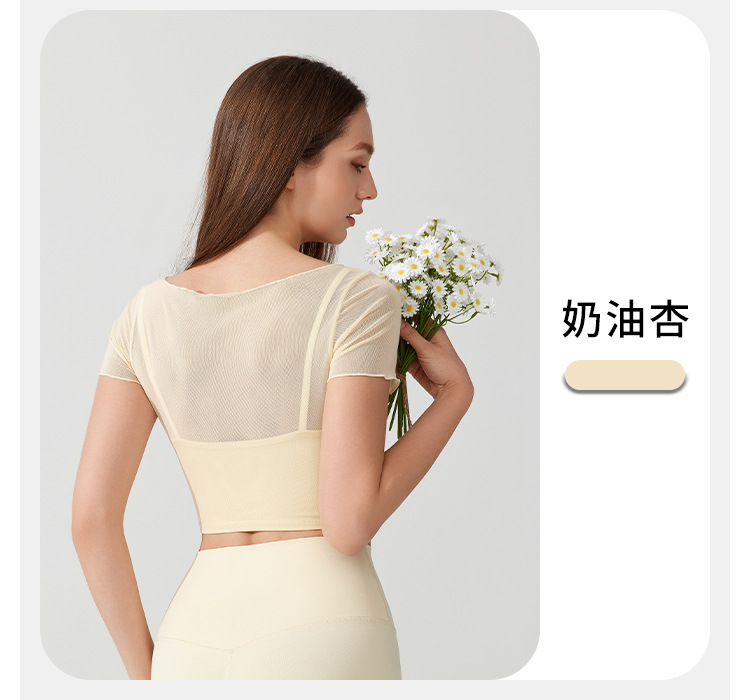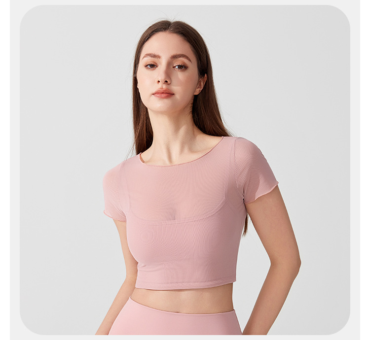 04/2025 Yoga wear, short-sleeved T-shirt with chest pads, sports top, mesh fabric, elegant and slimming, Pilates training and fitness wear