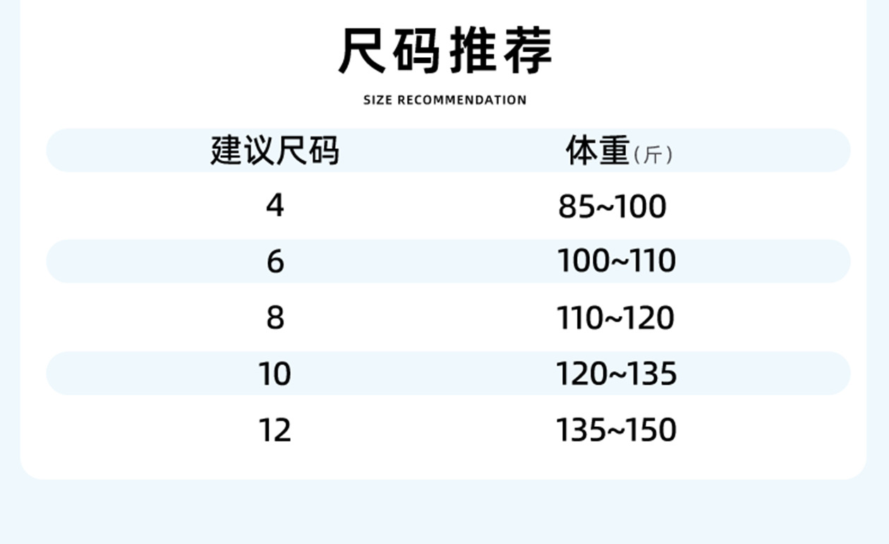 Size: 4 (85-100 catties), 6 (100-110 catties), 8 (110-120 catties), 10 (120-135 catties), 12 (135-150 catties)