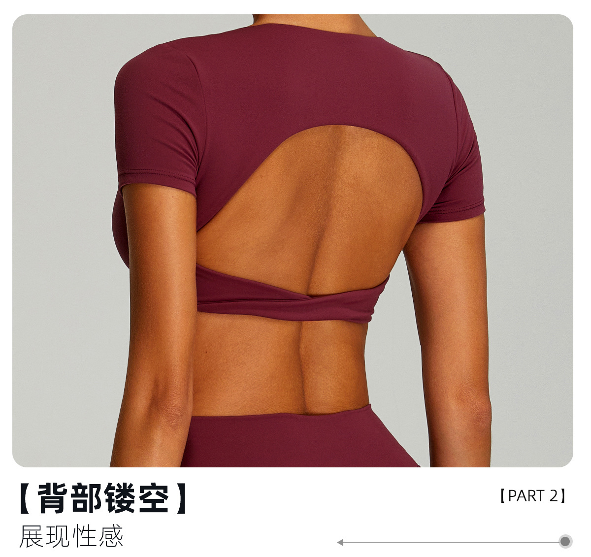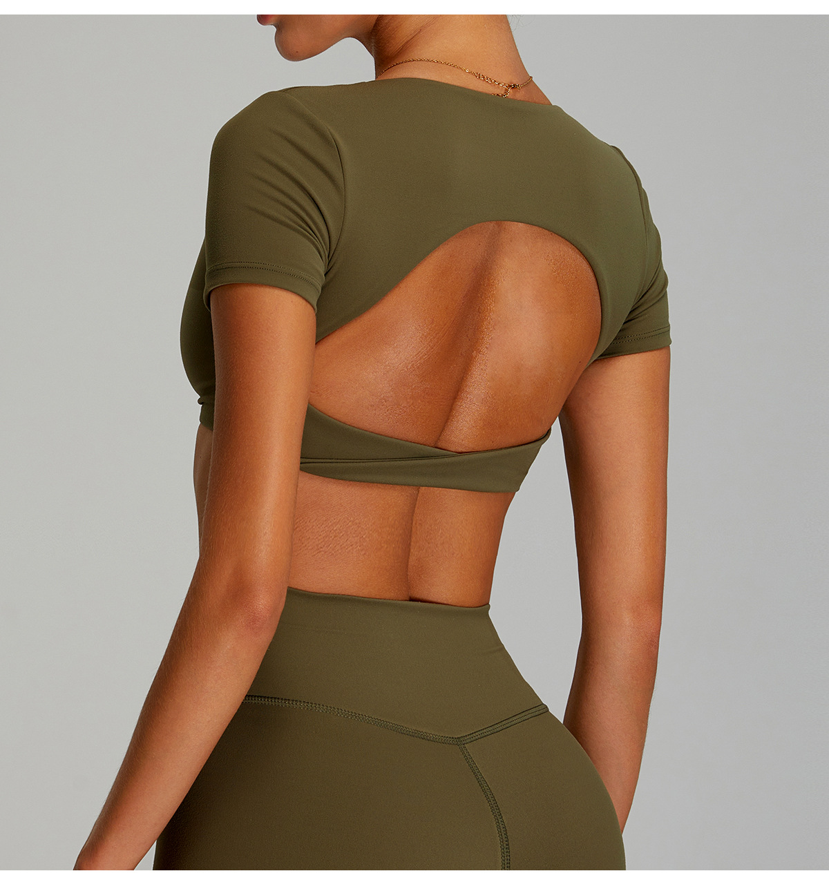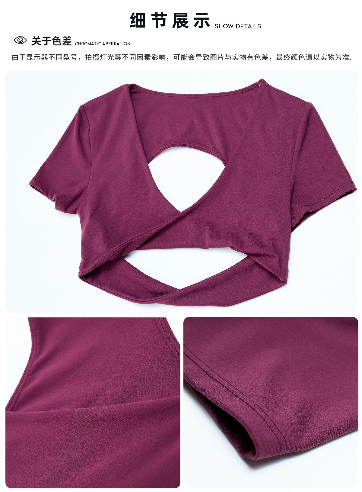 04/2025 Twisted open back short sleeves women's nude tight v-neck T-shirt sports fitness yoga wear tops