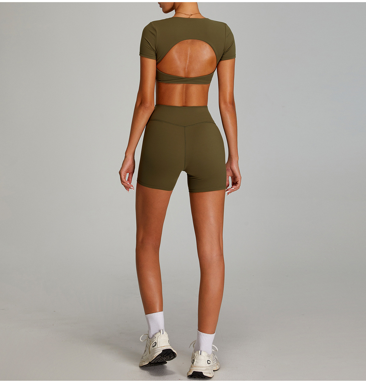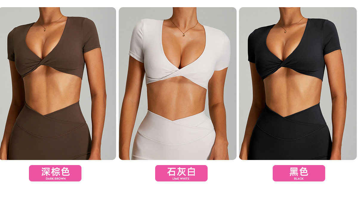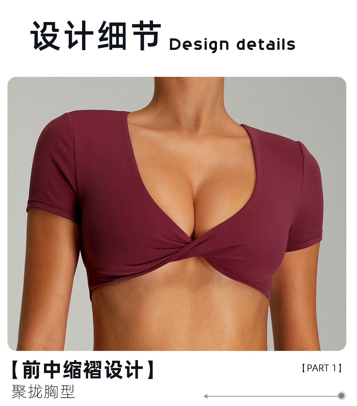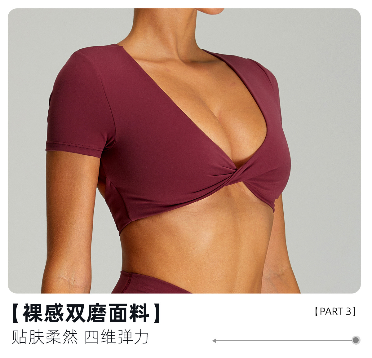 04/2025 Twisted open back short sleeves women's nude tight v-neck T-shirt sports fitness yoga wear tops
