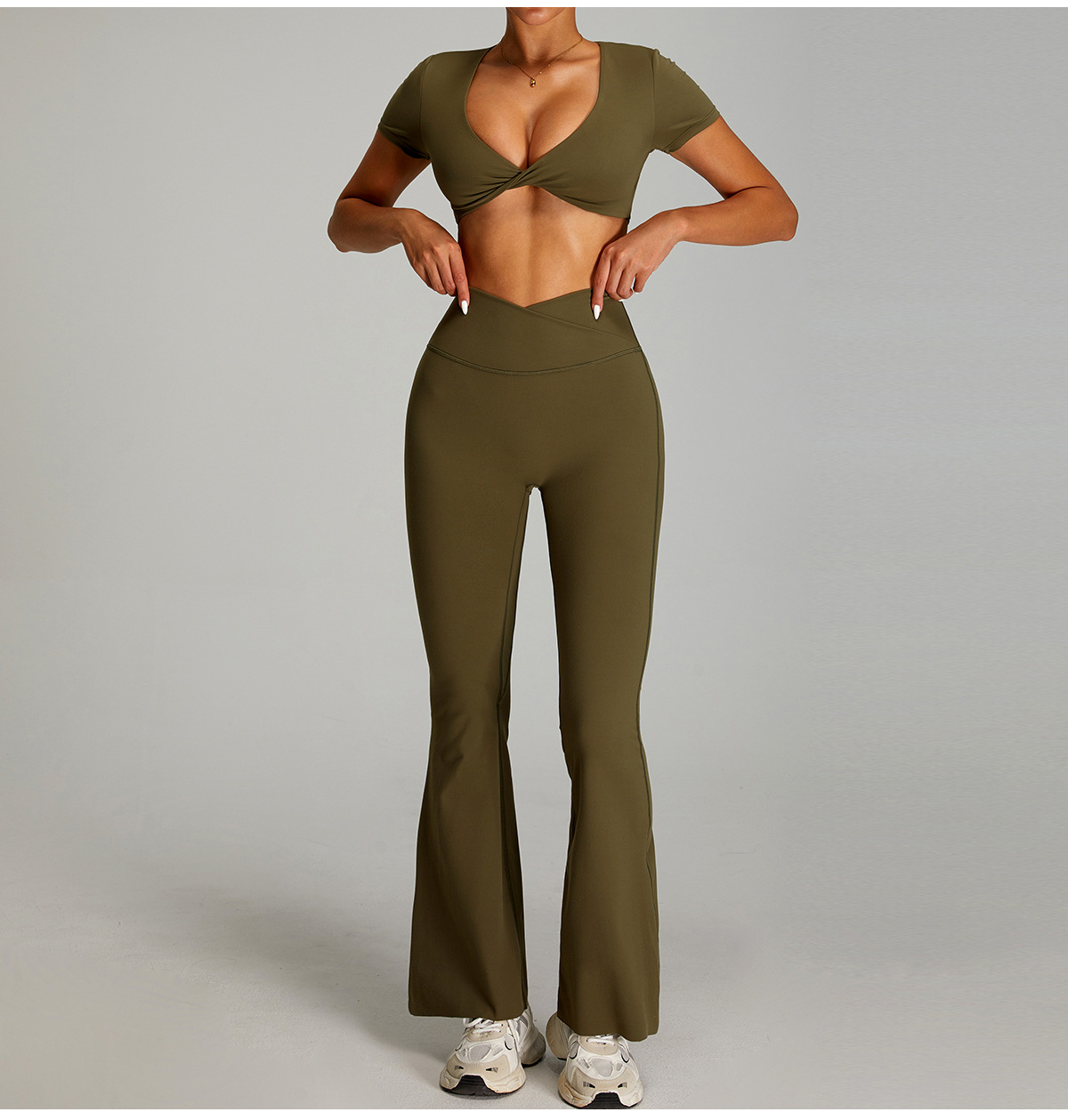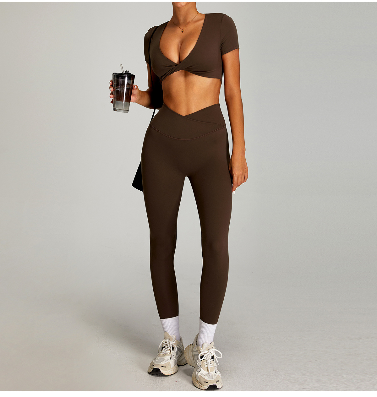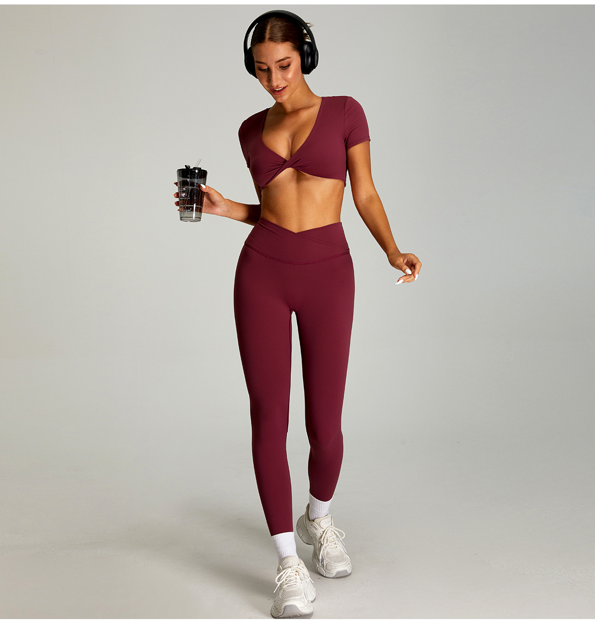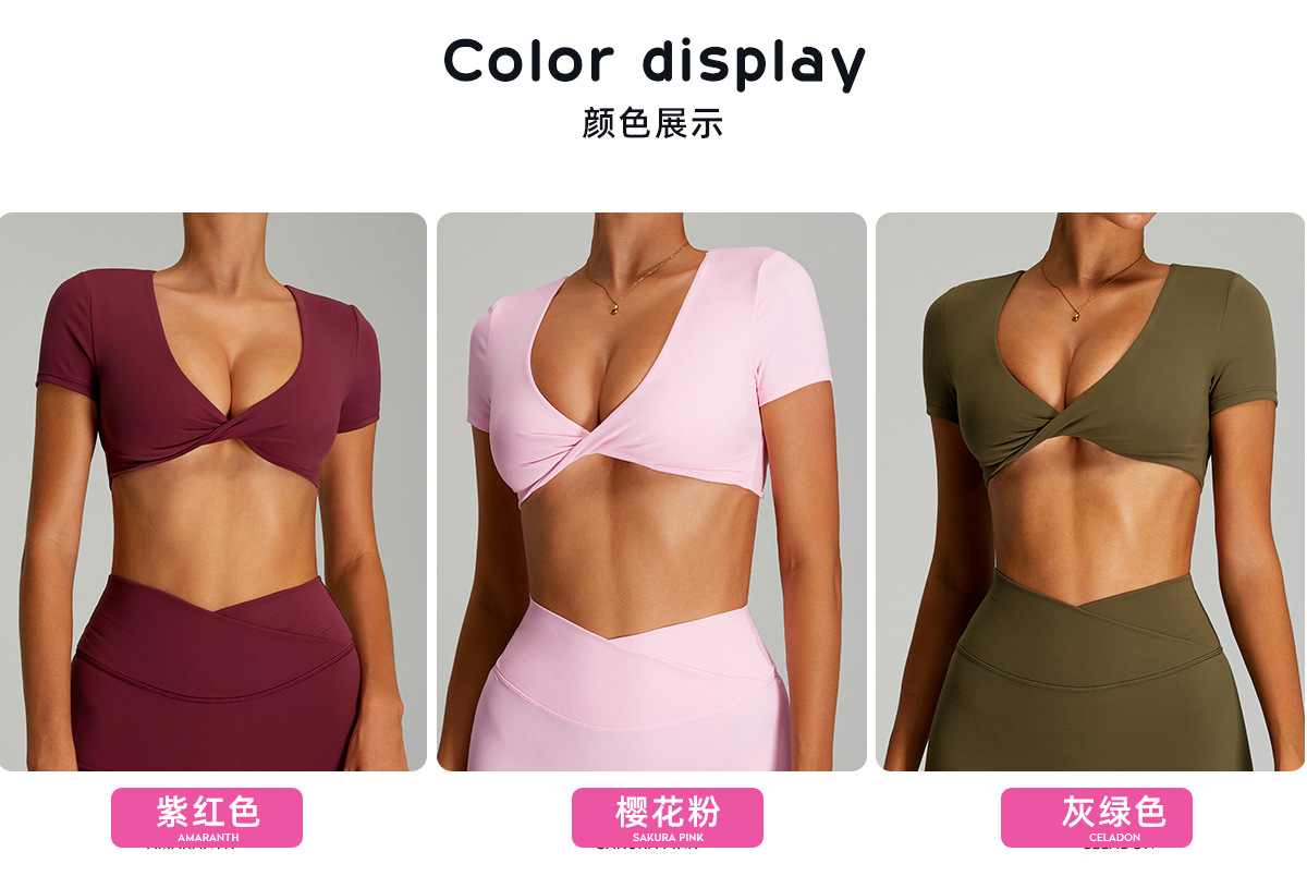 04/2025 Twisted open back short sleeves women's nude tight v-neck T-shirt sports fitness yoga wear tops