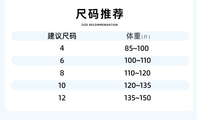 Size: 4 (85-100 catties), 6 (100-110 catties), 8 (110-120 catties), 10 (120-135 catties), 12 (135-150 catties)
