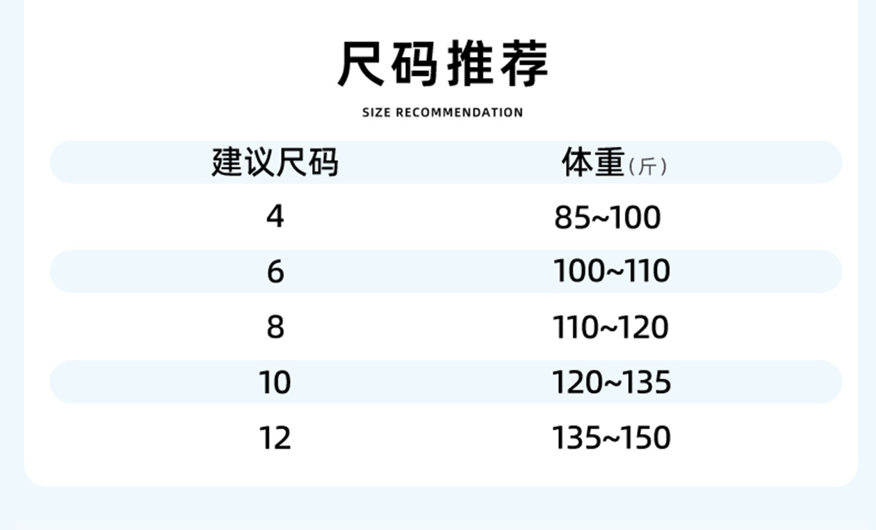 Size: 4 (85-100 catties), 6 (100-110 catties), 8 (110-120 catties), 10 (120-135 catties), 12 (135-150 catties)