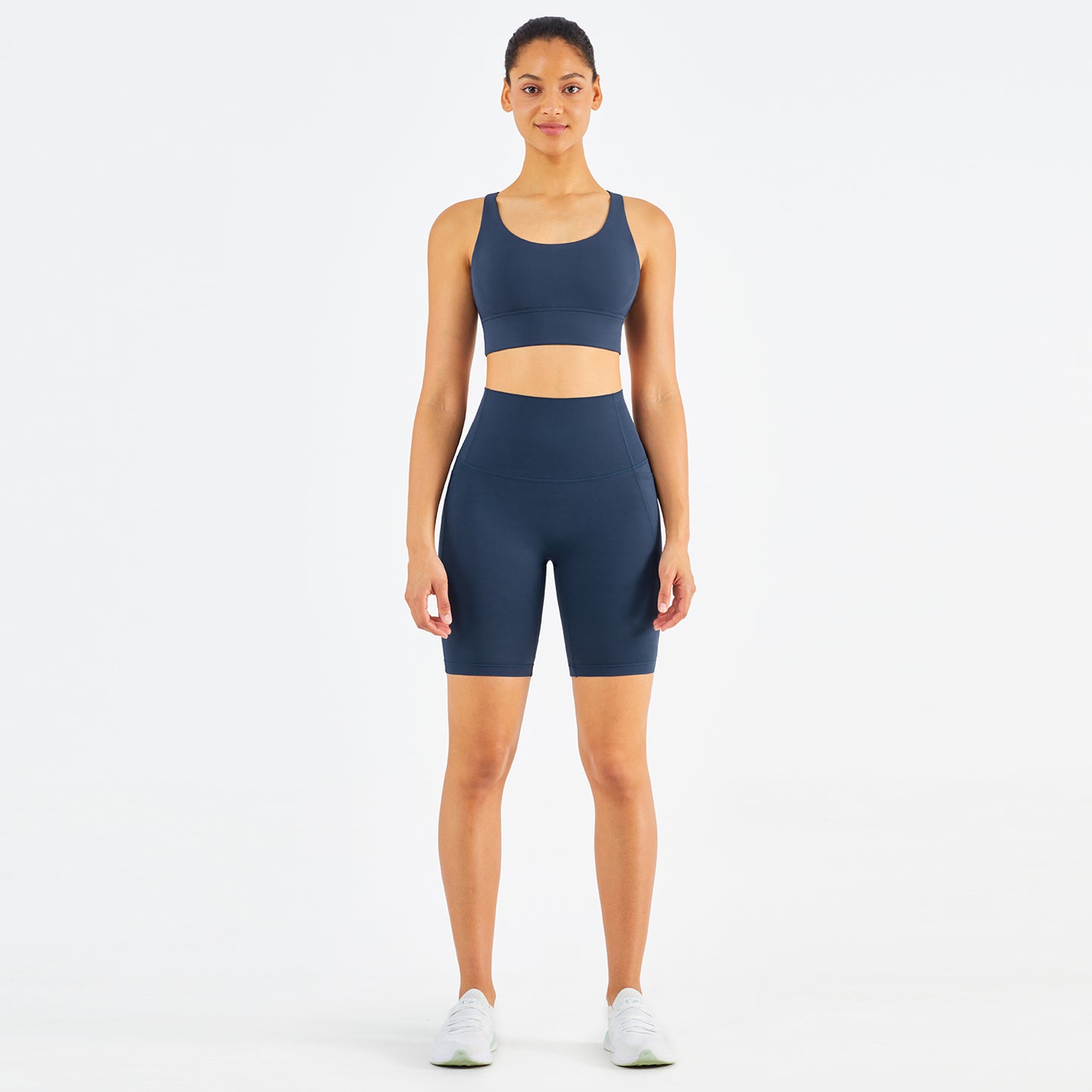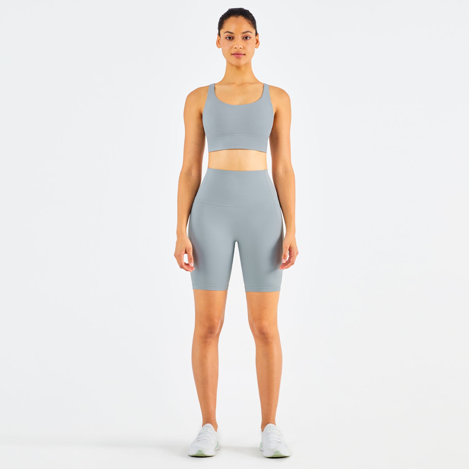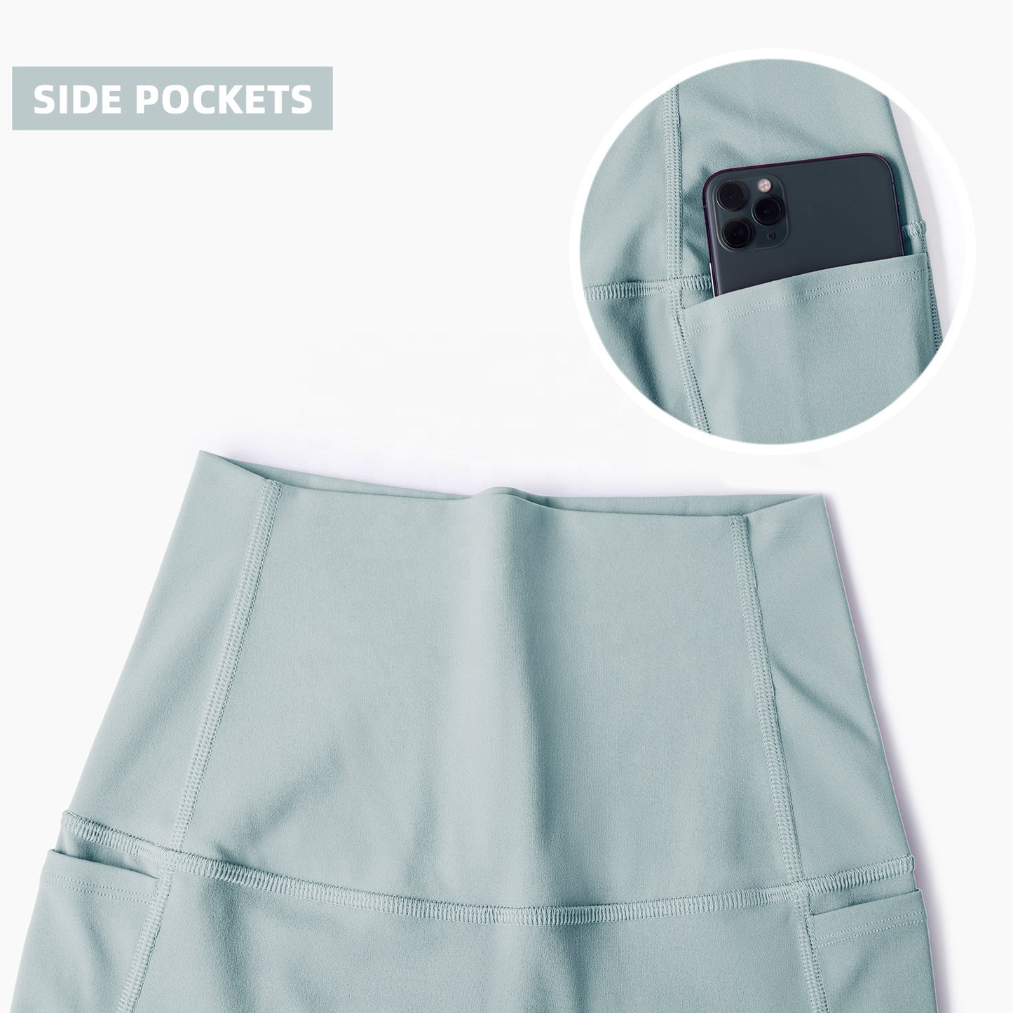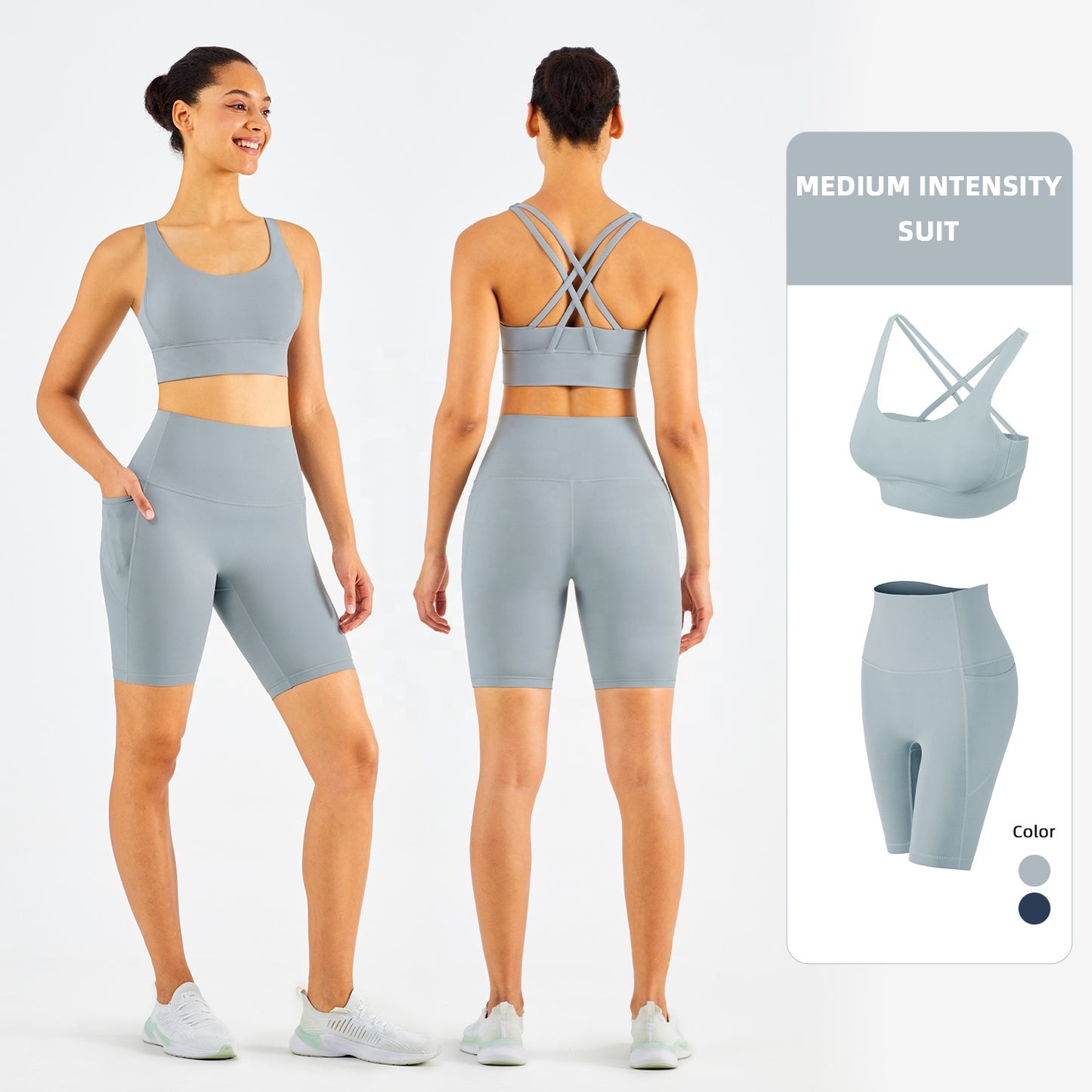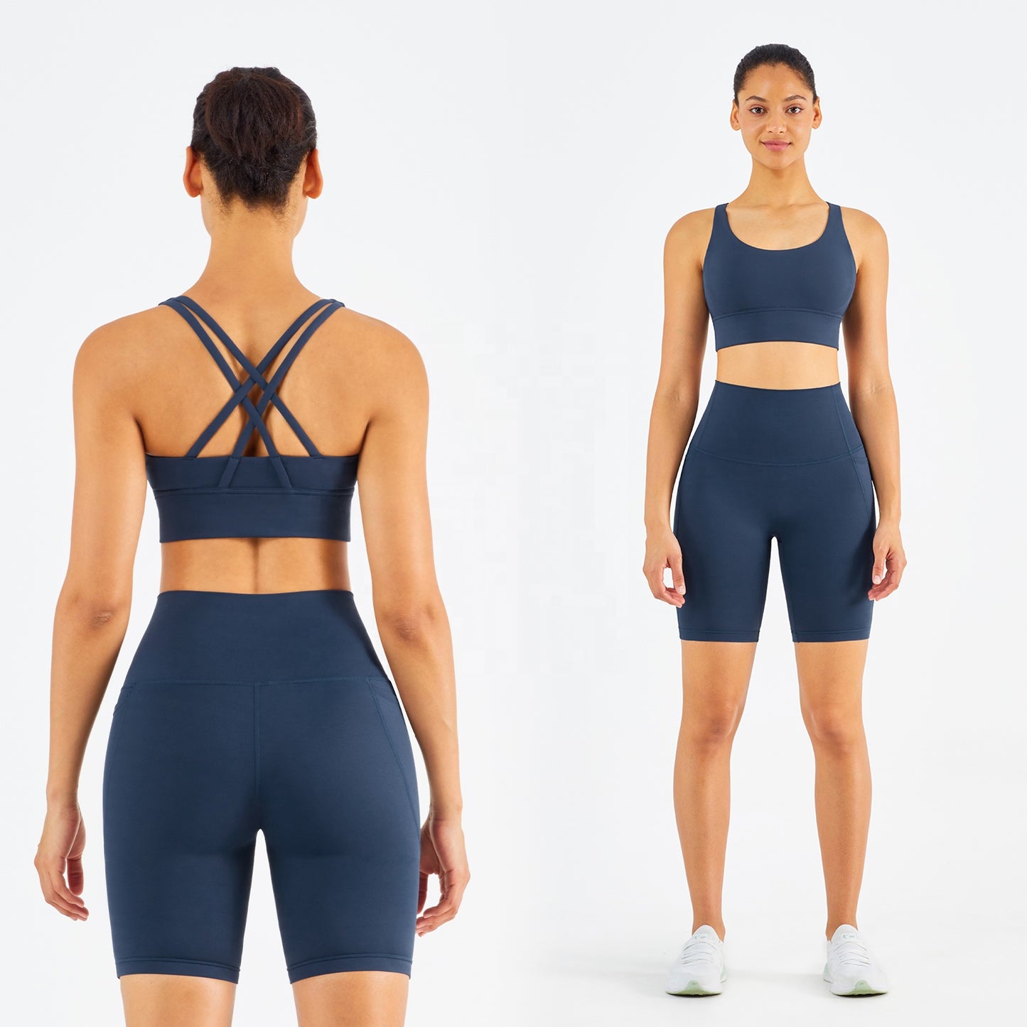 Custom Logo Yoga Short Sets Fitness Women 4 Way Stretch Pocket Leggings With Cross Back Bra