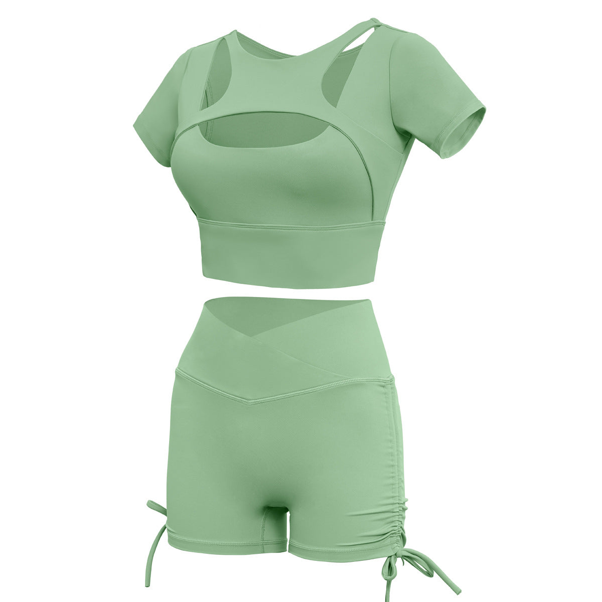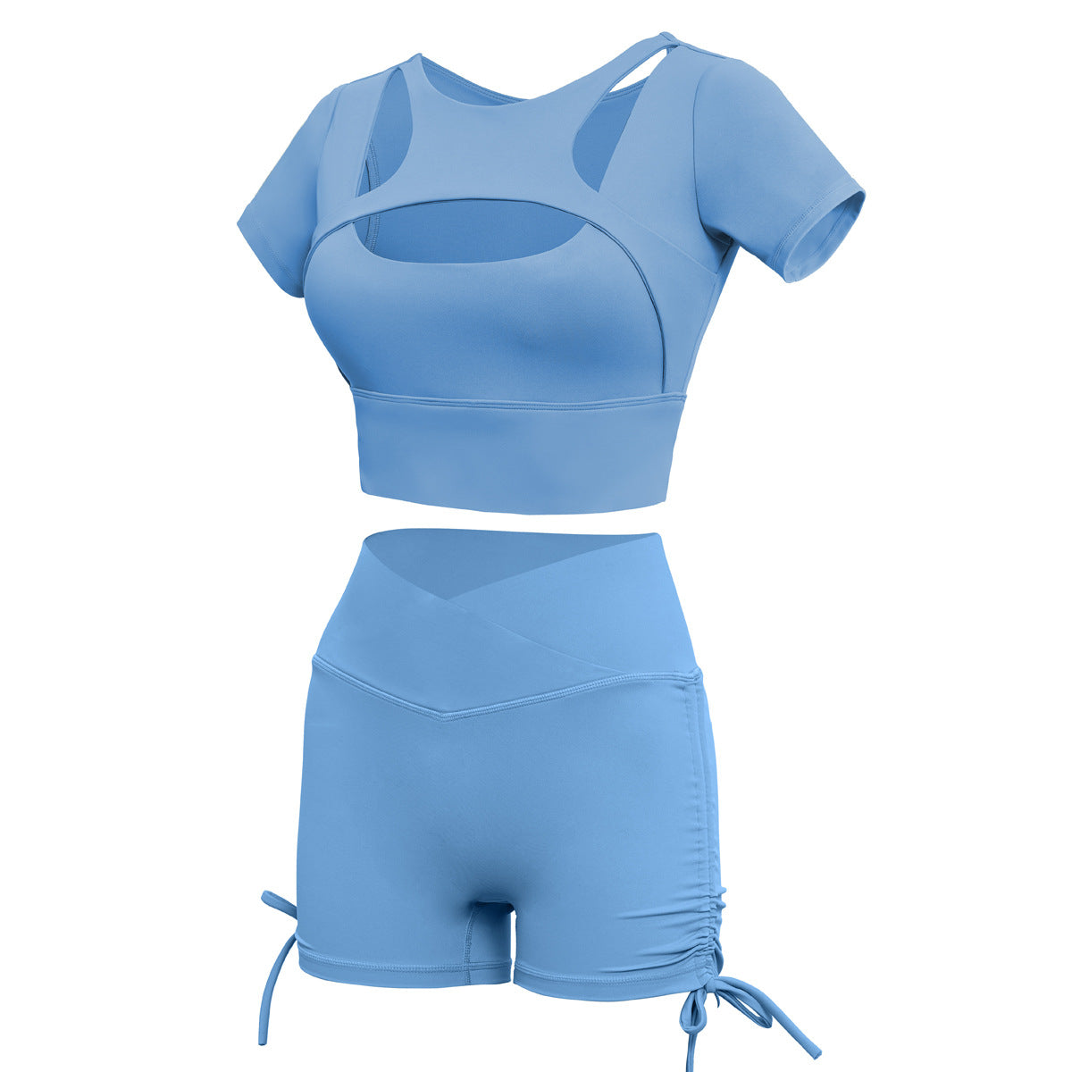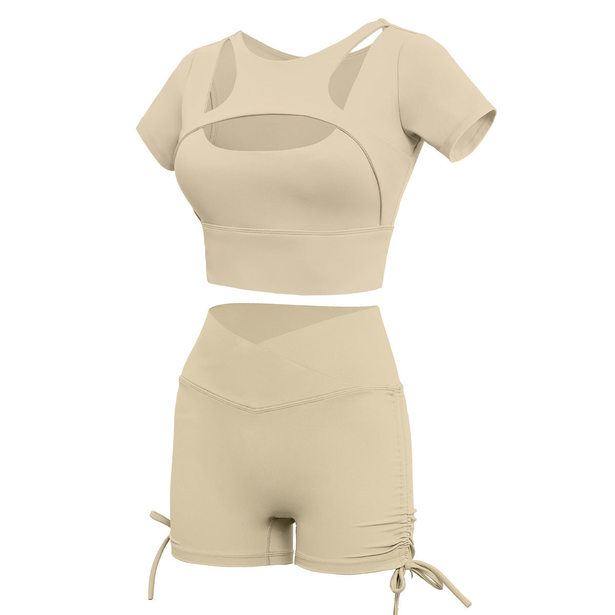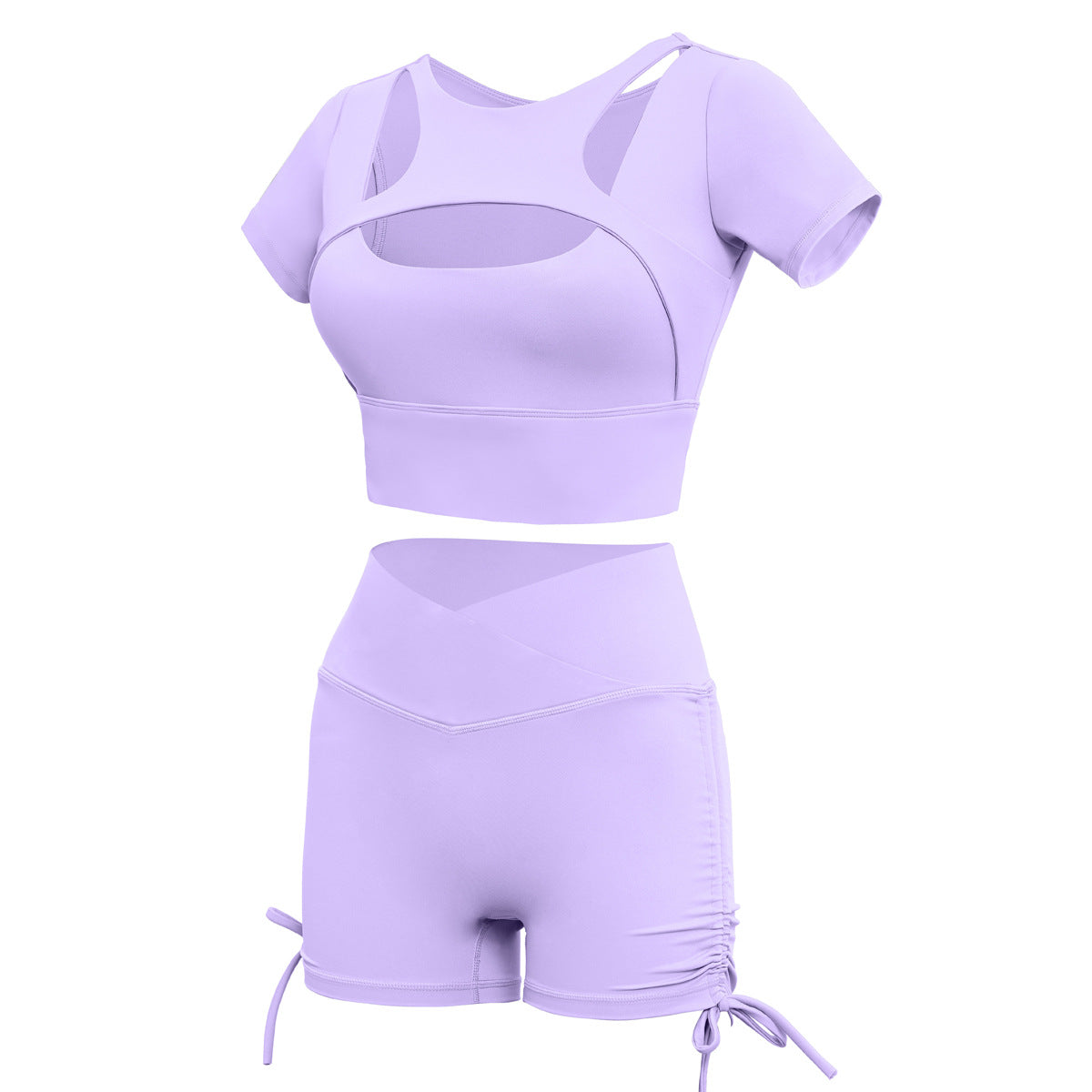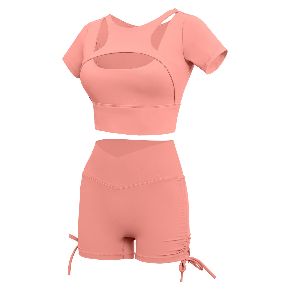 European and American sexy hollow short-sleeved yoga suit running sports top yoga T-shirt shorts fitness clothes yoga sets