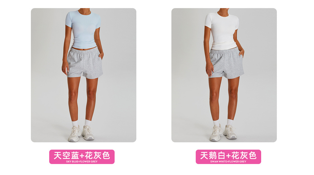 Color: Sakura pink (top + shorts), dark brown (top + shorts), black (top + shorts), swan white top + gray shorts (top + shorts), sky blue top + gray shorts (top + shorts), Sakura pink (top + trousers), dark brown (top + trousers), black (top + trousers), swan white top + gray trousers (top + trousers), sky blue top + gray trousers (top + trousers)