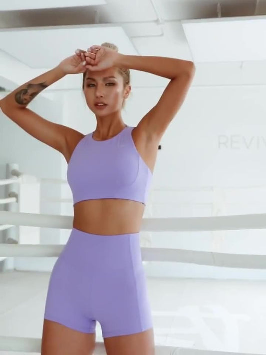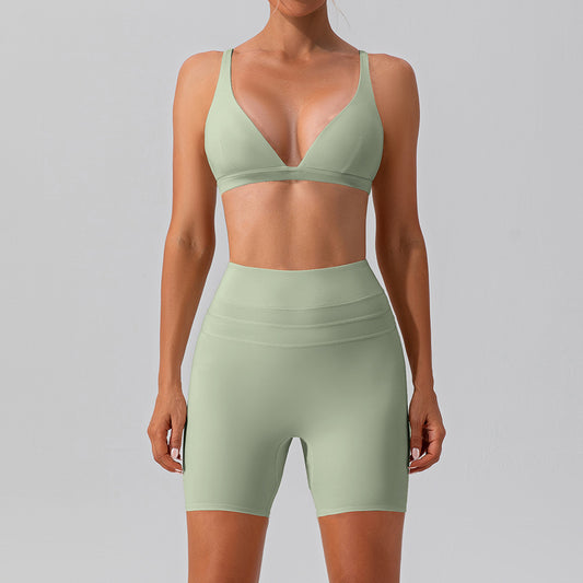 07/2023 Deep v-neck sports vest with chest pad 3-point pants shorts women's outdoor fitness training shockproof gathered beautiful back yoga bra