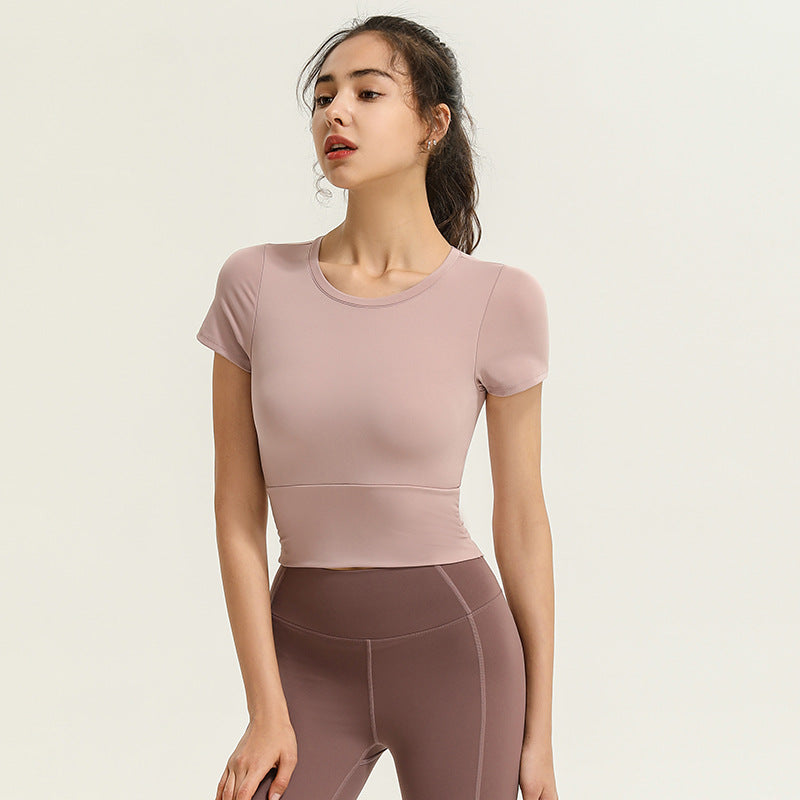 New short-sleeved yoga clothes with chest pad T-shirt women's tight stretch short umbilical running sports fitness top