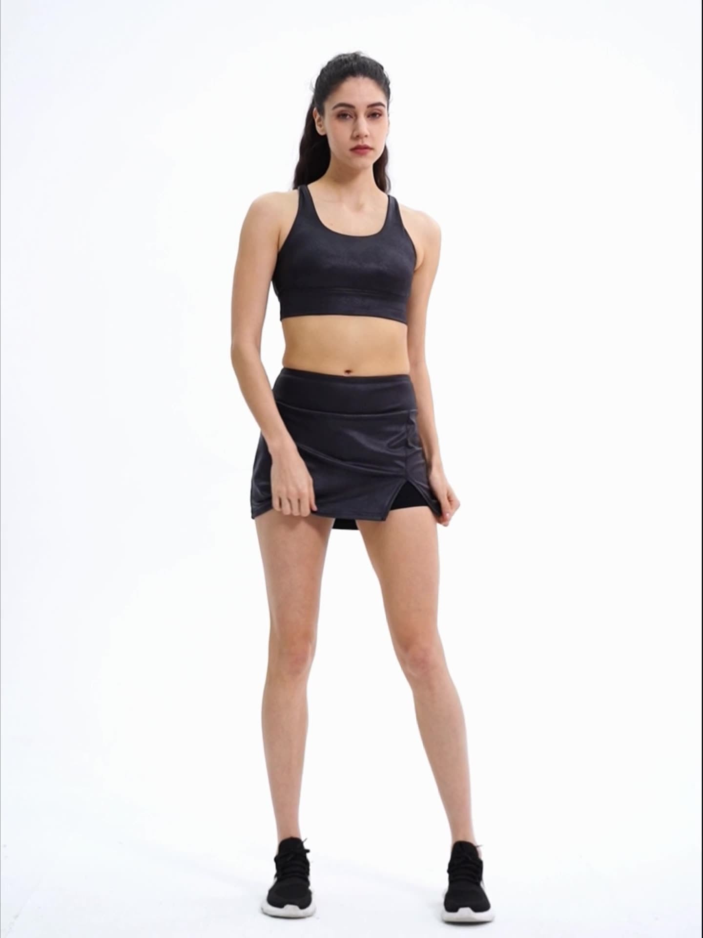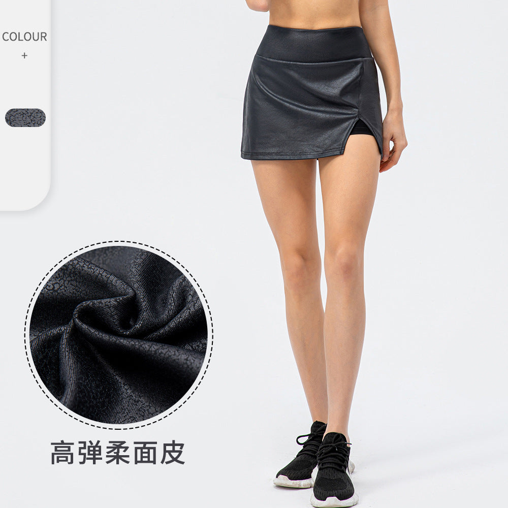 Spring and summer new tight sports skirt fake two-piece imitation leather high elastic breathable skirt fitness running culottes 22445
