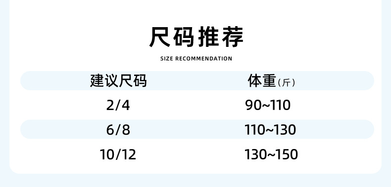 Size: 2/4 (90-110 catties), 6/8 (110-130 catties), 10/12 (130-150 catties)