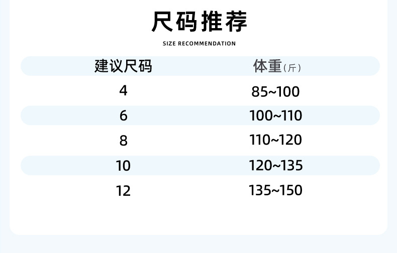 Size: 4 (85-100 catties), 6 (100-110 catties), 8 (110-120 catties), 10 (120-135 catties), 12 (135-150 catties)