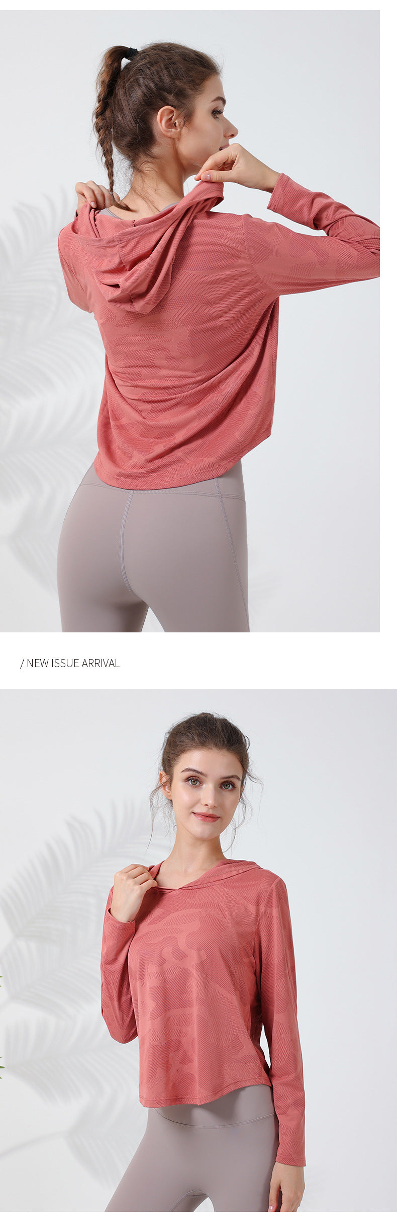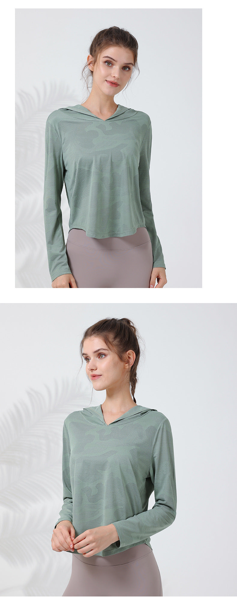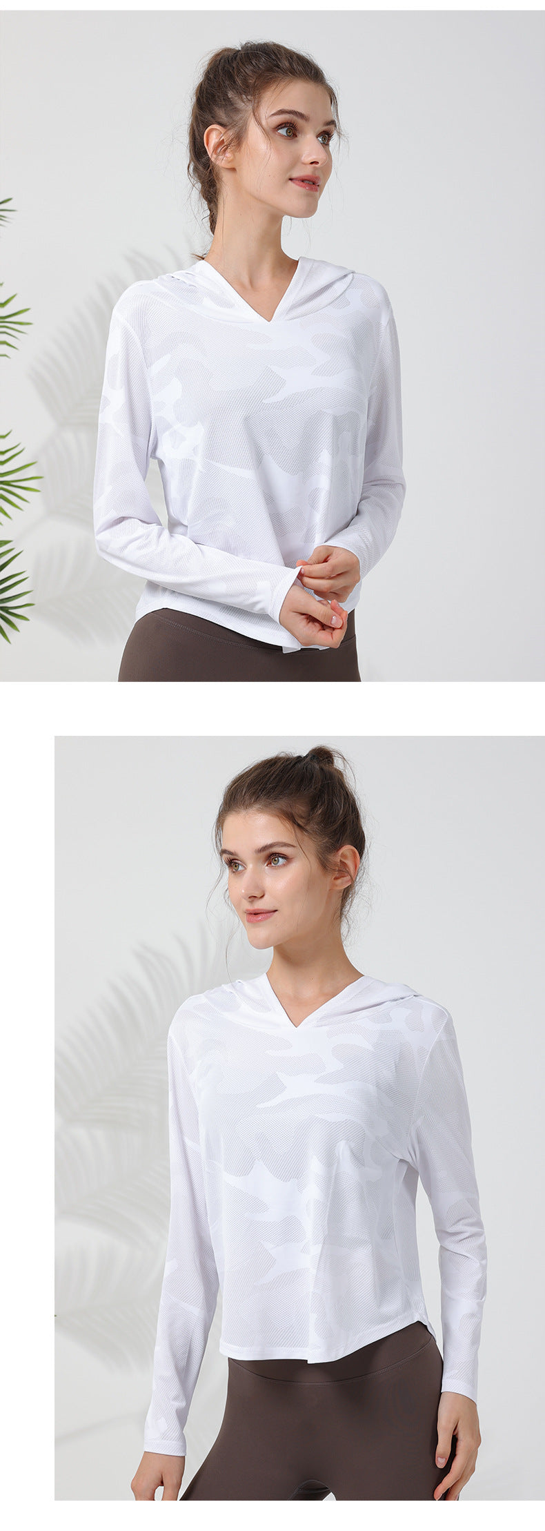 2023.08 New camouflage hooded long-sleeved women's quick-drying breathable curved hem outdoor sports yoga clothing to cover the abdomen and show thin T-shirt